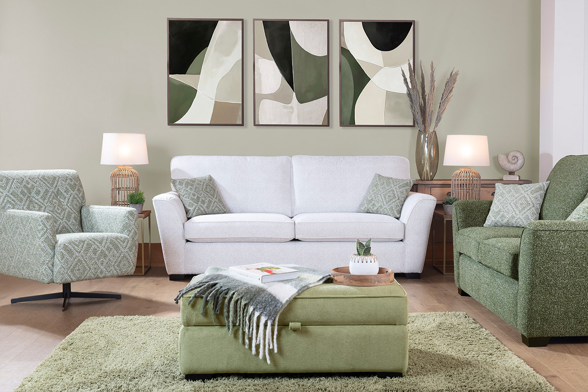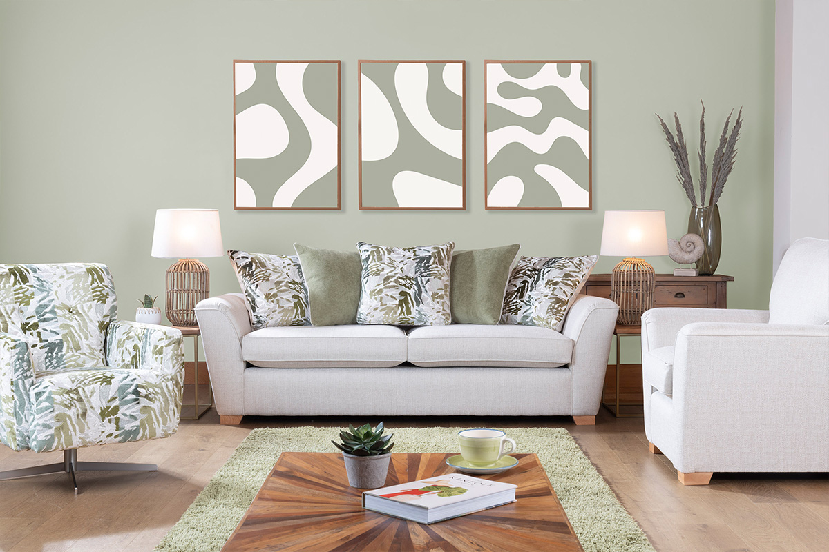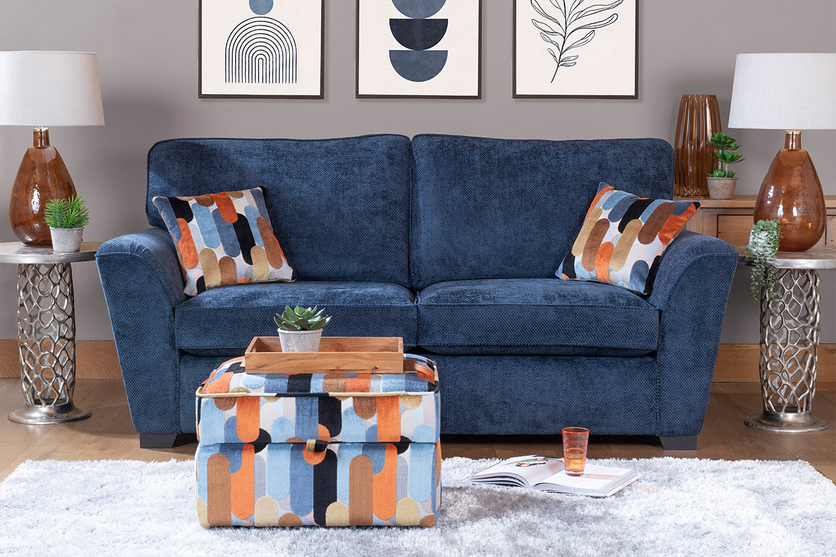 3 seater sofa/sofabed in fabric 1897, large scatter cushions in 1523, dark feet. 2 seater sofa/sofabed in fabric 1893, small scatter cushions in fabric 1523, dark feet. Fixed Back Accent chair in fabric 1897, chrome legs only.