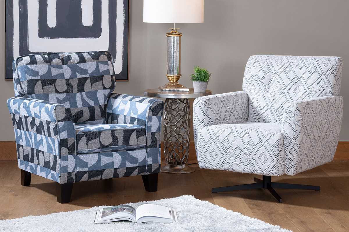 Swivel chair in fabric 5210, brushed nickel base Grand sofa (pillow back) in fabric 5788, 3 pillows in 5210/5788, 2 pillows in 5740/5788, light feet. Chair in fabric 5788, light feet.