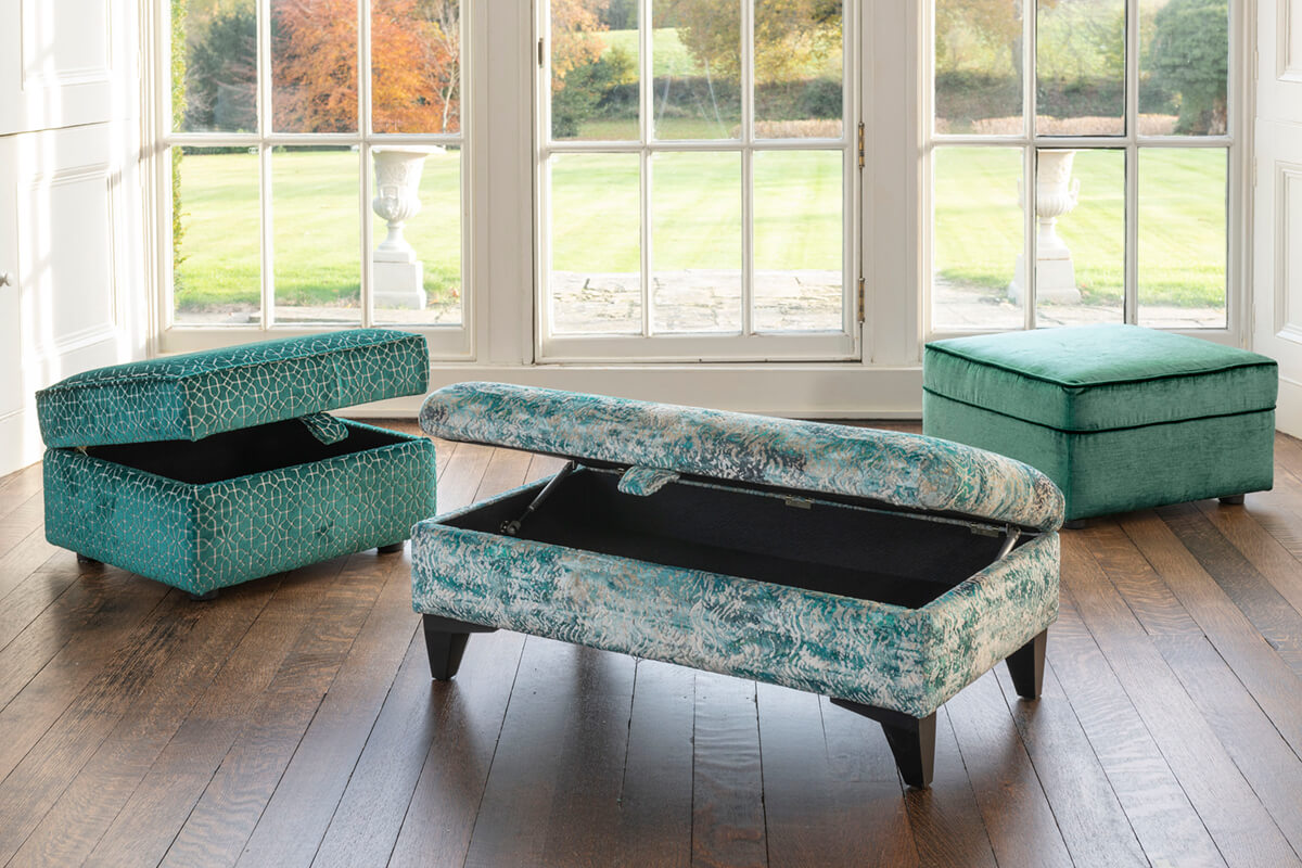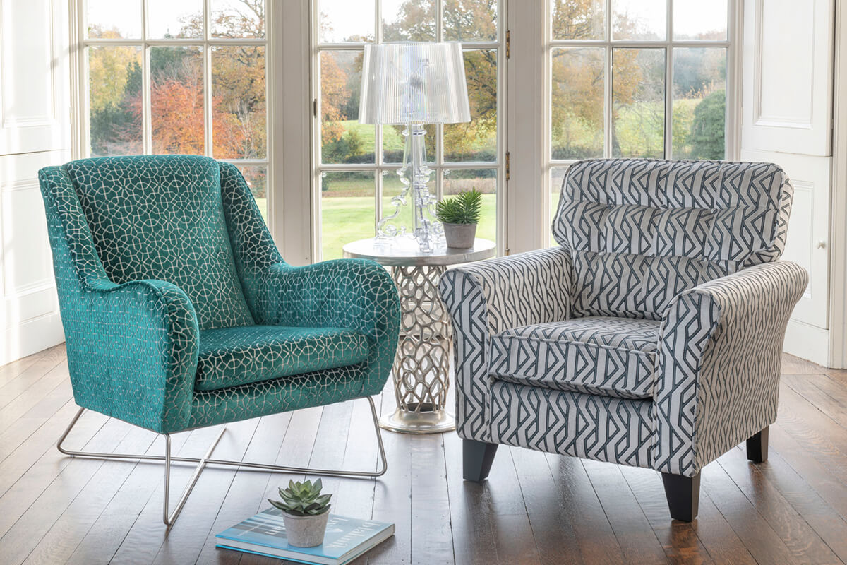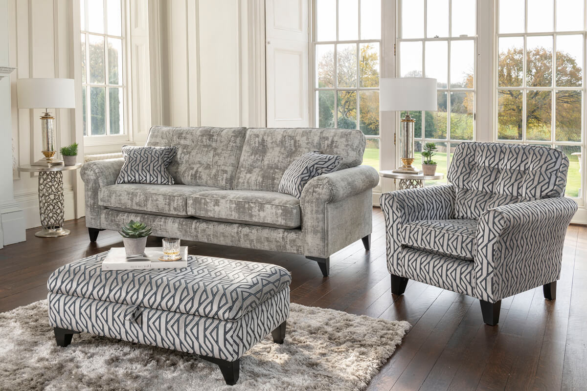 Grand sofa in fabric 0672, large scatter cushions in 0030, dark legs. Chair in fabric 0672, small scatter cushion in 0030, dark legs. 3 seater sofa in fabric 0670, large scatter cushions in 0030, dark legs. Legged Ottoman in fabric 0030, dark legs.
