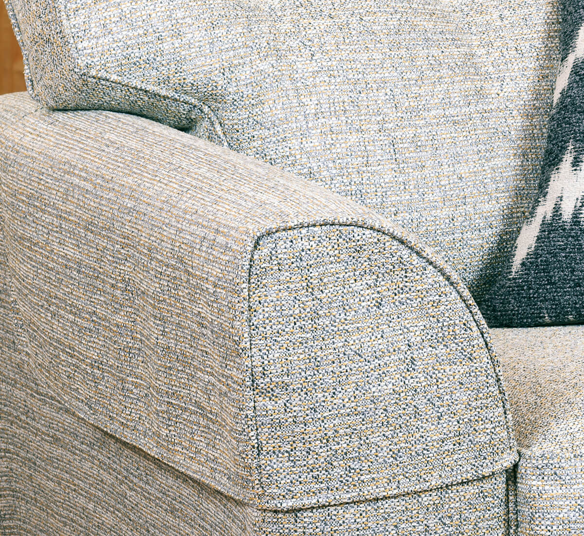 Accent chair in fabric 3037, show wood arms in light oak. Grand sofa in fabric 3707, large scatter cushions in 3037, satin nickel legs. 3 seater sofa in fabric 3623, large scatter cushions in 3037 light oak legs.
